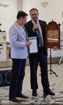 Глава города Петр Вагин вручил исполнительному директору аэропорта Владимиру Варавве часы в раме, вдохновлённой тобольскими наличниками, и подчеркнул, что часы эти всегда будут показывать лучшее время для развития нашего «Ремезова».