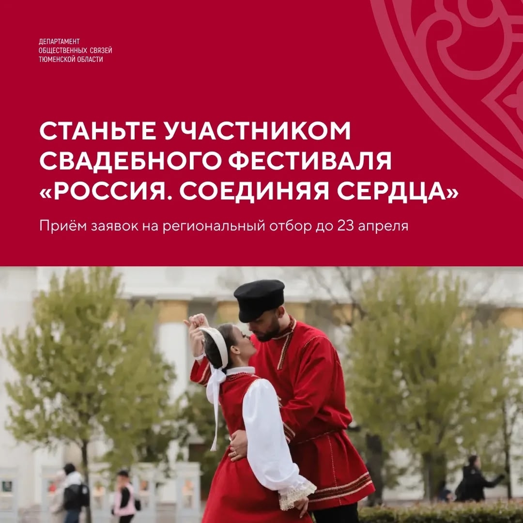 💬 Заместитель директора департамента общественных связей Тюменской области Роман Мамонтов: «Участие в фестивале — это возможность для пар из Тюменской области зарегистрировать брак в торжественной атмосфере и представить свой регион на всероссийском уровне. Мы сформировали экспертный совет, который поможет выбрать достойных участников».