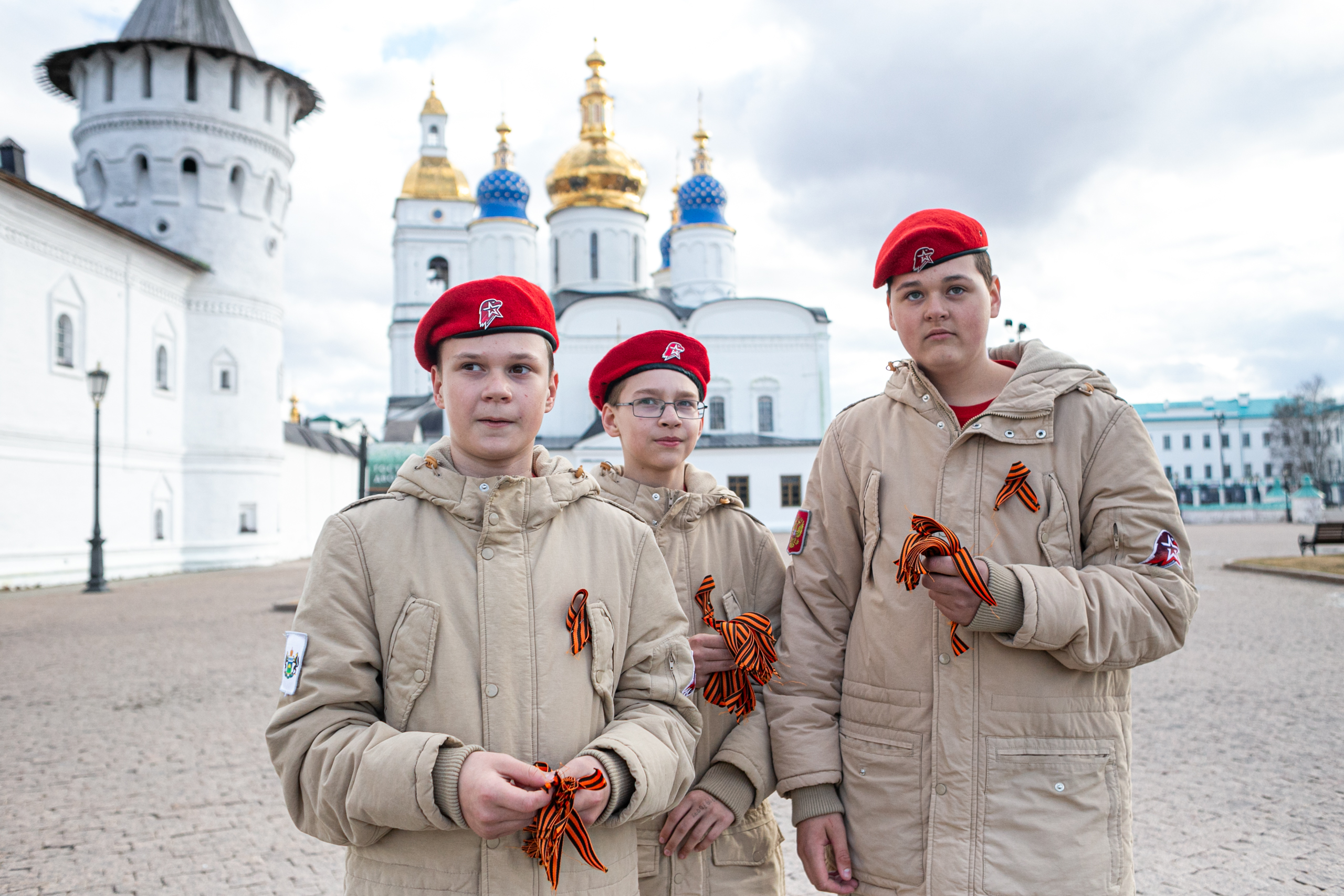 У стен кремля 20 юнармейцев центра «Россияне», волонтёры Победы и воспитанники, обучающиеся в центре добровольной подготовки к военной службе, раздавали прохожим символы доблести, мужества и подвигов русских солдат на полях сражений в Великой Отечественной войне.